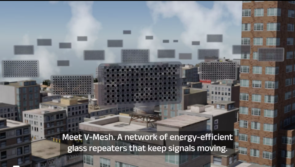 V-Mesh™ enables nth-generation connectivity by maintaining a continuous mmWave link indoors and out — routing signals across multiple hops through coordinated RF-on-Glass™ repeaters when direct line of sight is blocked.