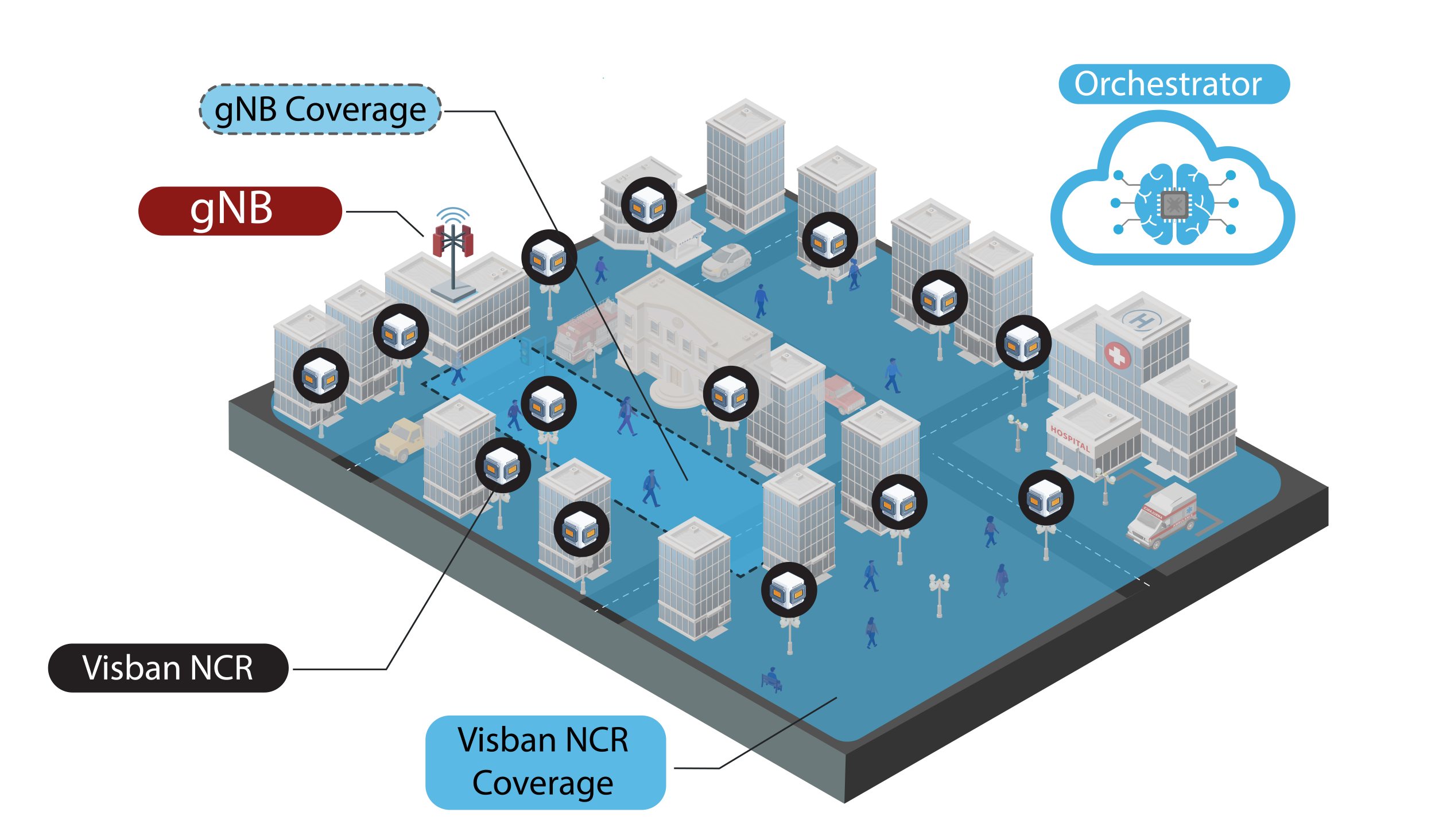 V-Mesh builds a coordinated propagation layer across Visban's network-controlled repeaters (NCRs), connecting them in multiple hops rather than relying on a single direct path. The AI Orchestrator continuously monitors device location and real-time signal quality to route traffic along the best available path — keeping the mmWave link stable even as conditions change.